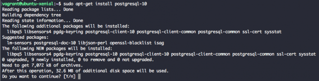 sudo apt-get updateWe’re ready to install PostgreSQL 10. Use the command below to install PostgreSQL 10 on Ubuntu 16.04.